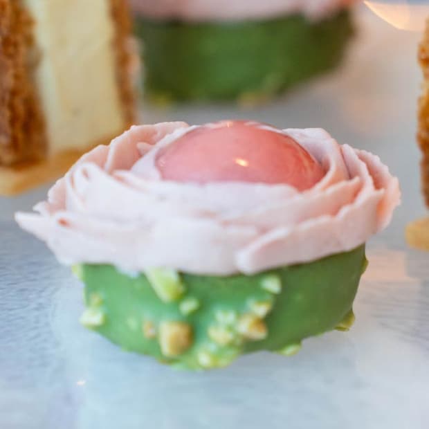 次にいただくのは、明るいグリーンカラーが映えるこちらのスイーツ。バタークリームを重なり合う花びらに見立てた逸品。