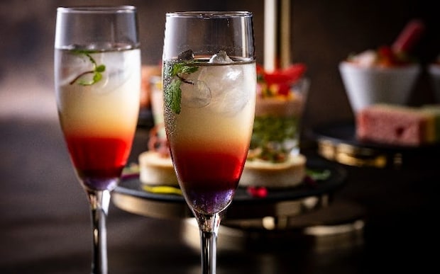 アフタヌーンティーの幕開けには、ウエルカムドリンク「ハーモニー・ガーデン」を提供。バタフライピーシロップにローズティーとラベンダー緑茶を合わせた華やかなノンアルコールカクテルで、すっきりとしたフローラルな味わいが楽しめる。