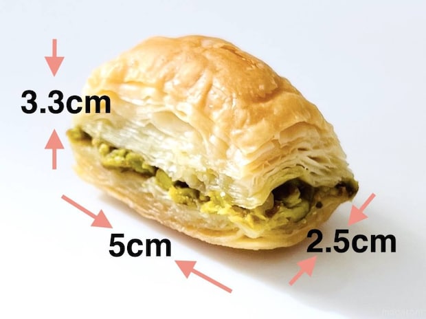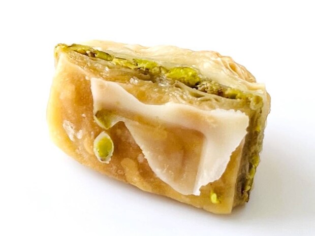パイ生地が何層にも重ねられており、表面にはところどころにシロップが塗られています。パイの間にはピスタチオがあふれんばかりにぎっしり!
