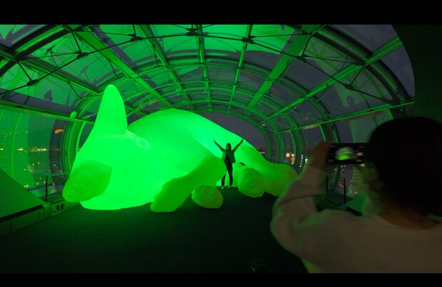 空中で居眠りをする巨大な猫が現れた!大和ハウスプレミストドームの展望台では、期間限定で「巨大な猫」をモチーフにしたアート作品が楽しめます。