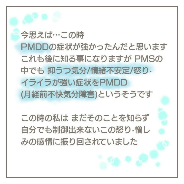 PMSだけでなく、PMDDという症状が強い時期だったヨカさん。自分ではどうやってもコントロールが難しく、振り回されては苦しんでいました。
