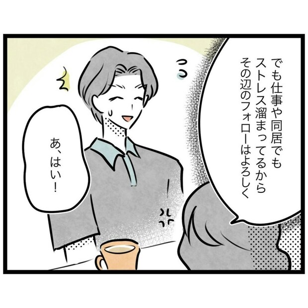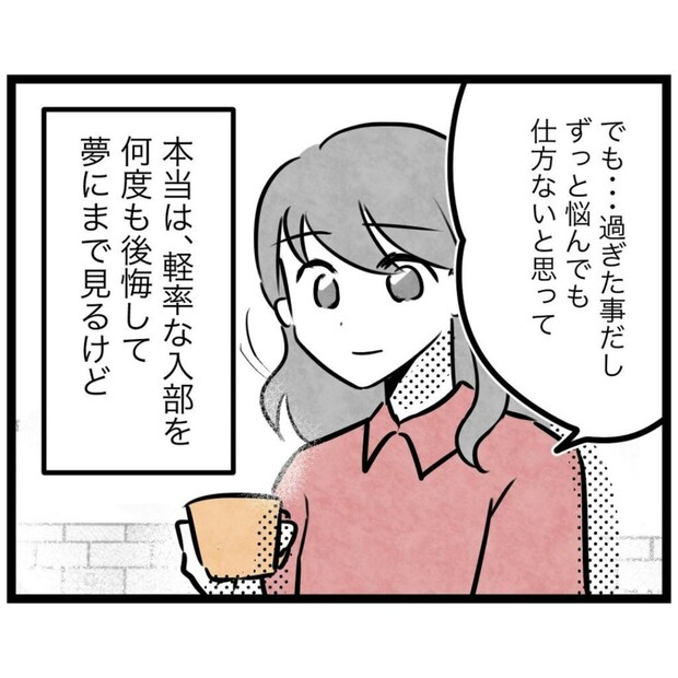 登山訓練に参加した息子を見送り、カフェでひと息ついていたもっつんさん夫妻。その会話の中で、夫がアローズに入部したことを悩んでいたもっつんさんの気持ちを、ずっと気にかけてくれていたことがわかります。けれども、夫はその悩みはもう過去のものだと思っているようで…。