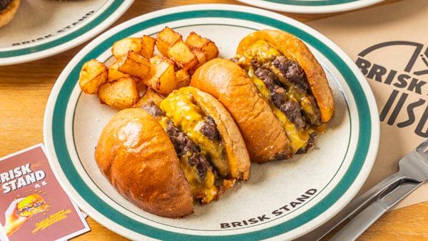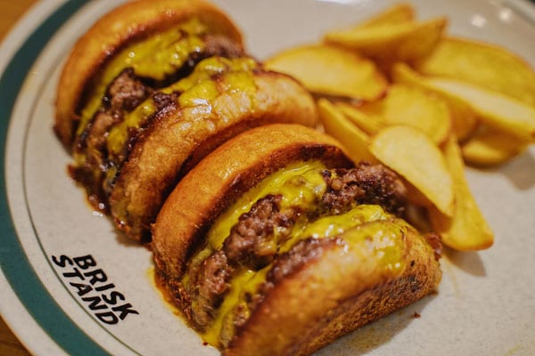 「BRISK STAND」の代名詞メニューは「切ったやつ ダブルパティ」2,500円(税込)。ただ切っただけではなく、パティから出た肉汁を半分に切った断面に吸わせて、半分に切った断面を熱々の肉汁で2度焼きし、断面をカリカリにして提供している。