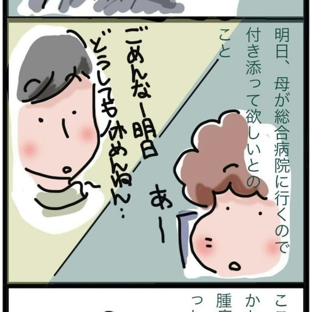 ある日突然、姉から母親の病院の付き添いを頼まれたおかんさん。姉から「母親の腫瘍マーカーが異常に高い」と聞き、不安な気持ちになりました。そのため、仕事を休んで母親を病院へ連れていくことに決めました。