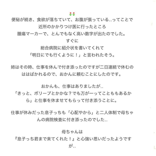 最近、おかんさんの母親は体調が優れず、かかりつけの医師に診てもらったところ、腫瘍マーカーの値が異常に高かったため、すぐに詳しい検査を受けるよう勧められました。