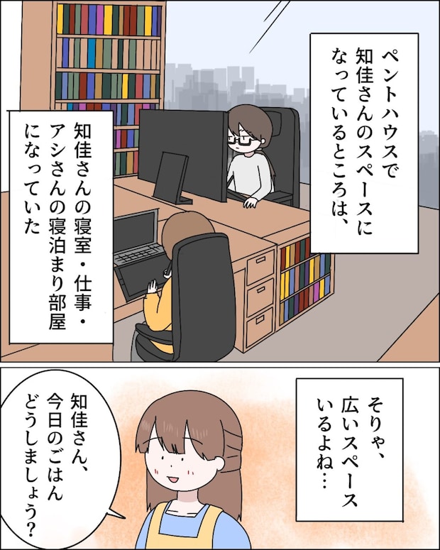今まで知らなかったけど、ペントハウスで知佳さんのスペースになっているところは、知佳さんの寝室、仕事、アシさんの寝泊まり部屋になっていたのです。