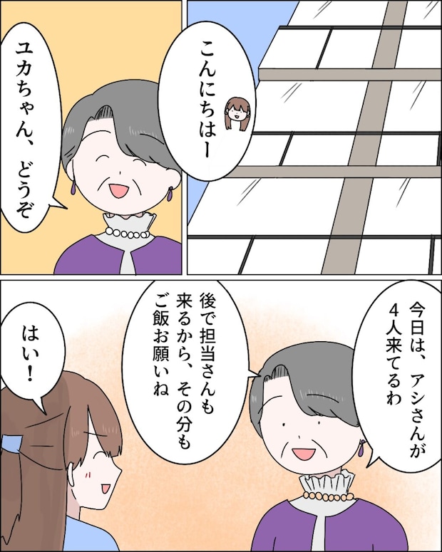 「こんにちはー」と知佳さんのマンションをたずねると、「ユカちゃん、どうぞ」と笑顔で迎えてくれた義母が、「今日は、アシさんが4人来てるわ。後で担当さんも来るから、その分もご飯お願いね」と言い、「はい!」私は義母の言葉をしかと受け止めました。