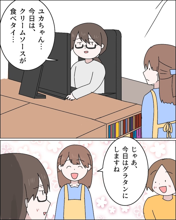 すると、「ユカちゃん・・今日は、クリームソースが食べタイ・・」と言う知佳さん。それを聞いた私が、「じゃあ、今日はグラタンにしますね」と言うと、知佳さんが嬉しそうな顔をしてくれました。