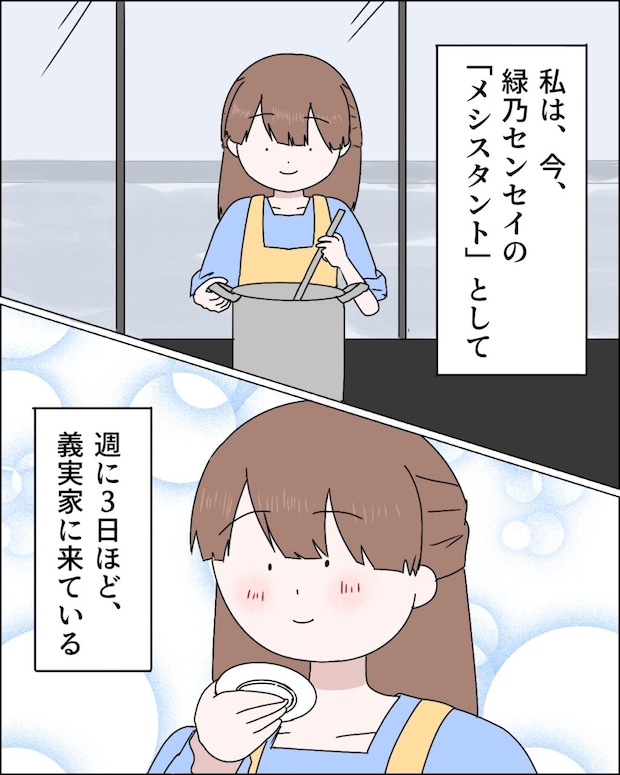 そう、私は今、緑乃センセイの『メシスタント』として、週に3日ほど義実家に来ているのです。緑乃センセイだけでなく、アシさんや担当さんの食事を作るのが私の仕事。