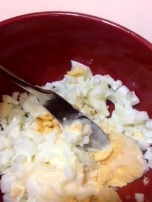 1. ゆで卵は白身と黄身に分け、白身は包丁でみじん切り。黄身を入れたボウルに白身を加え、マヨネーズを入れて混ぜます。
