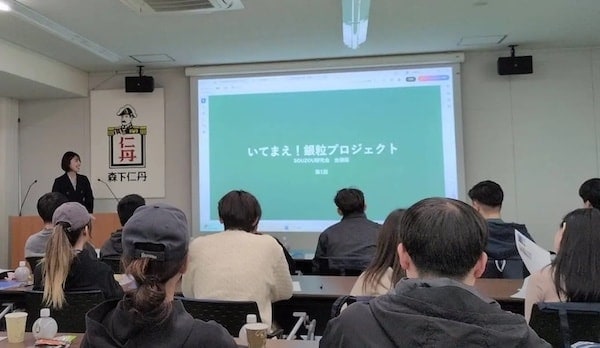 近畿大学経営学部商学科 井出ゼミ生は18人。2025年度、5月から6月にかけ京都仁丹樂會が行った京都市内の町名表示板の現存調査にゼミ生も参加した。さらに、11月からは森下仁丹とのコラボ事業として、森下仁丹の歴史、事業内容、銀粒の「仁丹」のリブランディング活動を学んだうえで、学生をターゲットに銀粒の「仁丹」をSNSで紹介し、認知度を高めるための広告企画案を作成、提案した。
