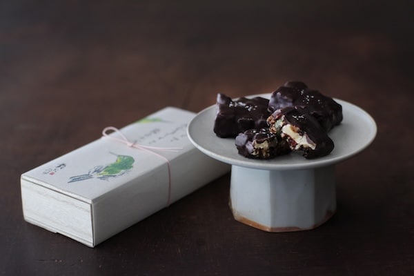使用するのは、ドミニカ共和国産のカカオ豆を用いたベルギー産ビターチョコレート。ダークチョコレートと京丹後の天然塩が、素材の味わいや実山椒の香りを引き立て、輪郭のある余韻へと導く。