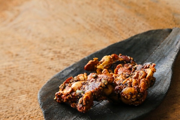 「果柯」の土台となる「果椒」は、数種の木の実や自然な甘みのドライフルーツに山椒をしのばせ、歯ざわりよく寄せ固めた和久傳の定番菓子だ。ぴりりとした爽やかな実山椒の風味とともに、大地から生まれる多彩な味わいや香りが広がる。