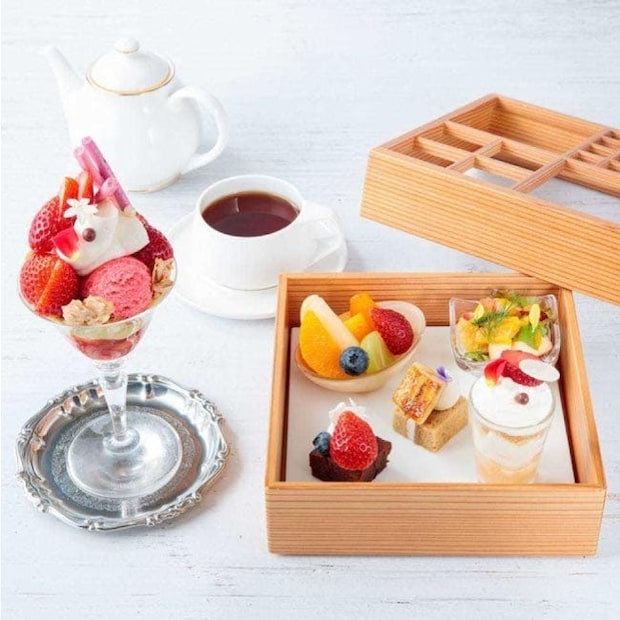 旬のフルーツを使用した小菓子といちごのミニパフェのセットをご提供。ミニパフェは、苺パフェのエッセンスをとじ込めた贅沢な味わい。組子箱に入ったセイボリーとプティフール5種はシェフのこだわりが感じられる逸品。