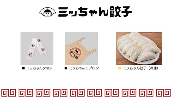 富山県のミッちゃん餃子からは冷凍餃子ほか、タオルやエプロンが販売される。