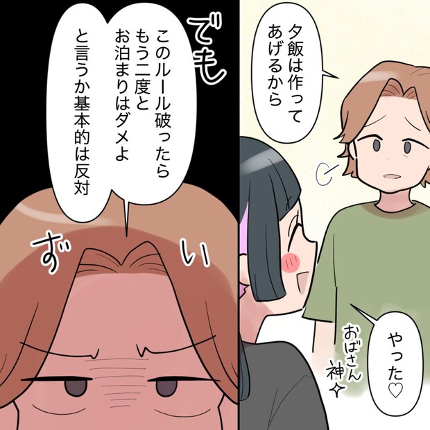 息子ミズキ君の彼女エリカちゃんが自分の知らない間にミズキ君の部屋の窓から出入りしていて6日も家に泊まっていたと知り驚愕したお母さん。二人にお説教をしつつ理由を聞くと、エリカちゃんは二人暮らしのおばあちゃんが入院してしまい寂しくて泊まりに来ていたことがわかりました。窓からの出入りやキッチンの無断使用もミズキ君が許可していたとはいえ、それに対して何の疑問も持っていない様子のエリカちゃん。あと2日間だけ泊まらせてほしいと2人にお願いされたお母さんは、別々の部屋で寝ることを条件に仕方なくお泊まりを許可し、他所の家の冷蔵庫を勝手に開けない、家主の不在中に一人で家に居ない、と当たり前のことを伝えると、エリカちゃんは「えぇ!?」と驚愕。そんなエリカちゃんの反応にお母さんも驚きます。