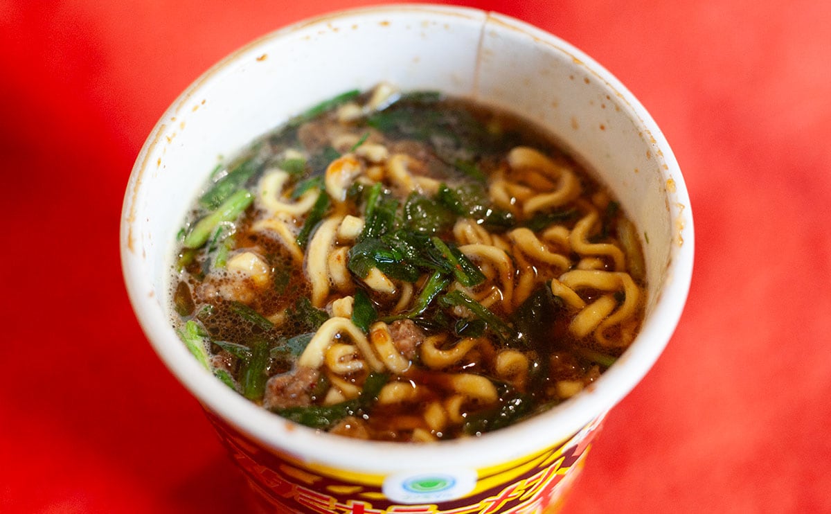 お湯を注いで、待つこと5分。先ほどの調味油を加えて、よく混ぜたら完成です。フタを開けたときは、そこまで強烈なニンニク臭がしないのが不思議なんですよね。