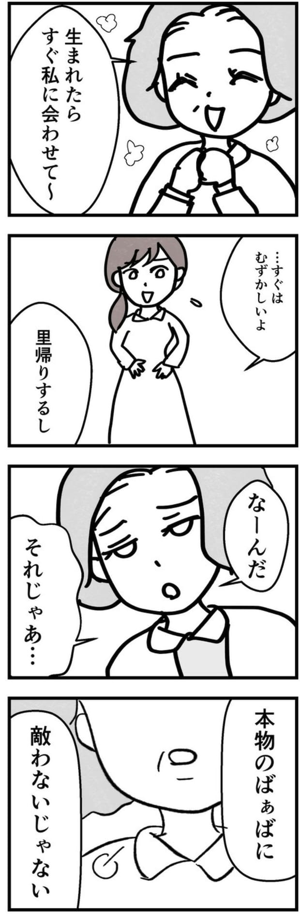 おなかの子に向かって「喜美子ばぁばよ〜」と語りかける友人に、まゆさんは思わず戸惑いを覚えます。