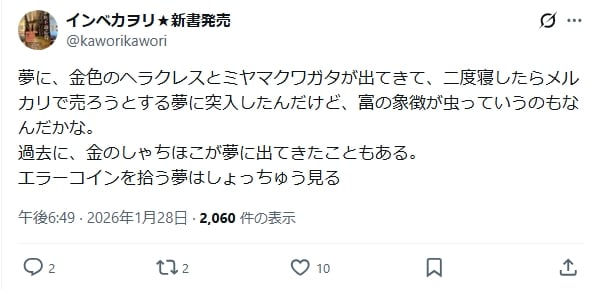 その金のヘラクレスを見たあと、私はそのまま二度寝し、今度はその昆虫を売るために、メルカリで売り方を調べている、という続編に突入した。