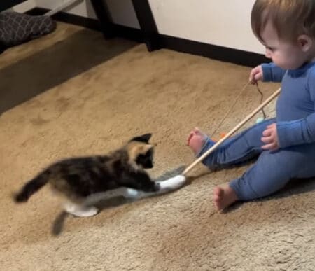 子猫と一緒に遊んでいる赤ちゃん。