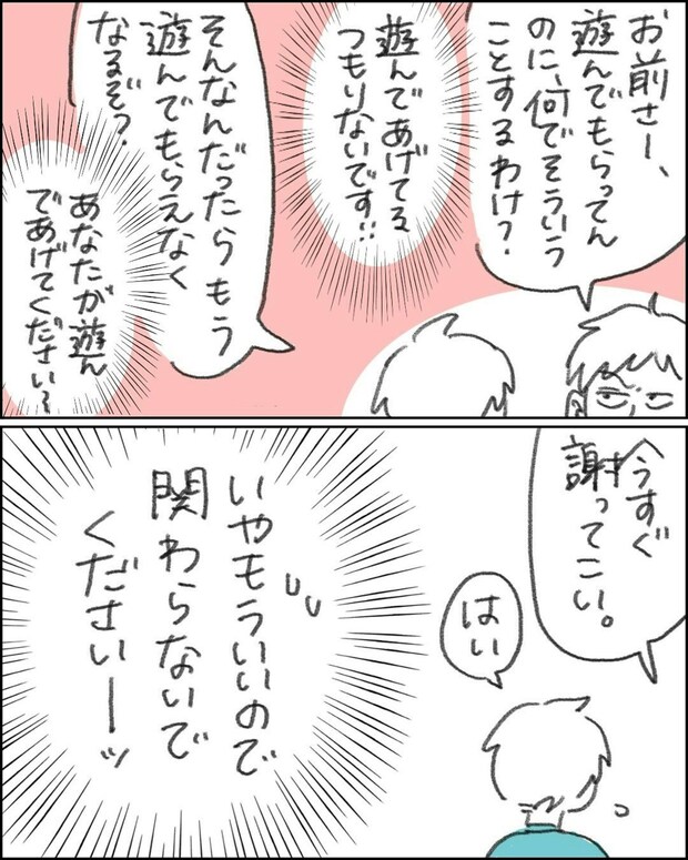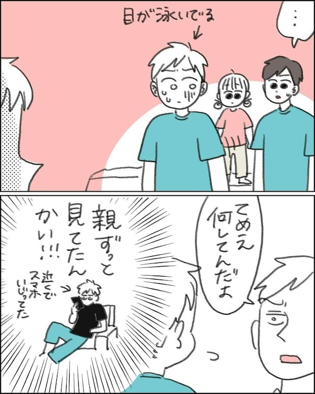 スマホに夢中で、子どもを放置していた父親…。迷惑をかけた主人公家族にあやまることもなく、男の子を勢いのままにしかりつけました。