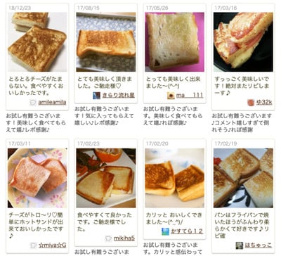 つくれぽ(作りましたフォトレポートのこと)では、「とろとろチーズがたまらない。食べやすくおいしかったです」「チーズがトロ〜リ!簡単にホットサンドが出来た!」などの声が多数届いています。