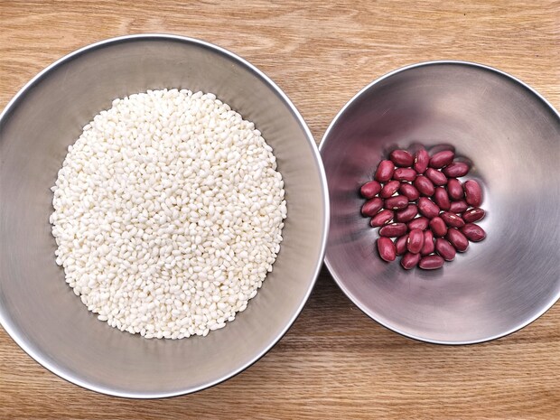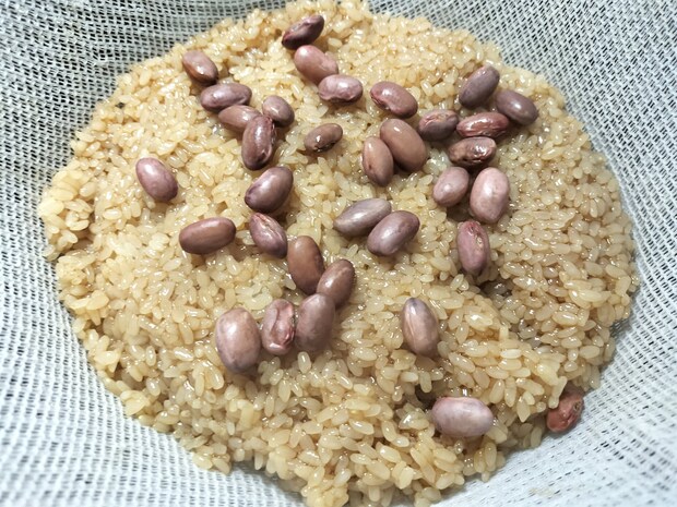もち米と金時豆はそれぞれ一晩水に浸け、ザルに上げて水気を切っておきます。