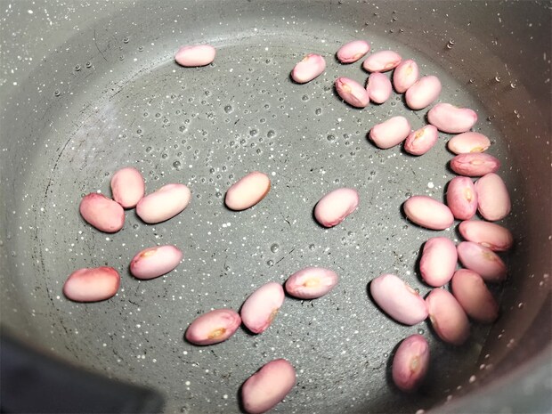 きれいなあずき色だった金時豆は、一晩水に浸けると少し色が抜けて薄茶色になっています。