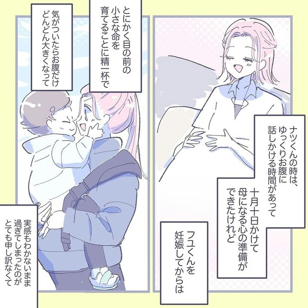 第一子ナツくんの妊娠中は、「母になる心の準備ができた」と感じる heraco.さん。一方、フユくん妊娠中は、ナツくんの育児に集中していたこともあり、妊娠の実感もあまりありませんでした…。