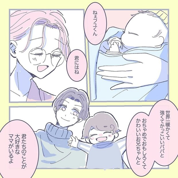 フユくんの小さな手が、指を力強くつかむのを感じ、heraco.さんは無性に愛しく思えてきます。そして、ウデの中で眠るフユくんに、最高のパパとお兄ちゃん、そして、そんな家族が大好きな ママがいるのだと教えてあげるのでした。