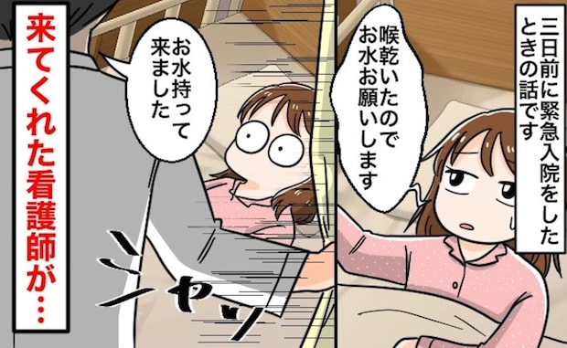 夜に救急車を呼んで入院になってその日の夜中に目が覚めて喉が渇いたので看護師さんを呼んだんですけど