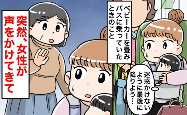 降りようと立ち上がった瞬間に、見知らぬ女性から「ベビーカー持ちますよ」と声を掛けられたMさん。誰かからこのような声を掛けられるなんて全く考えていなかったMさんはとても驚いたそうです。
