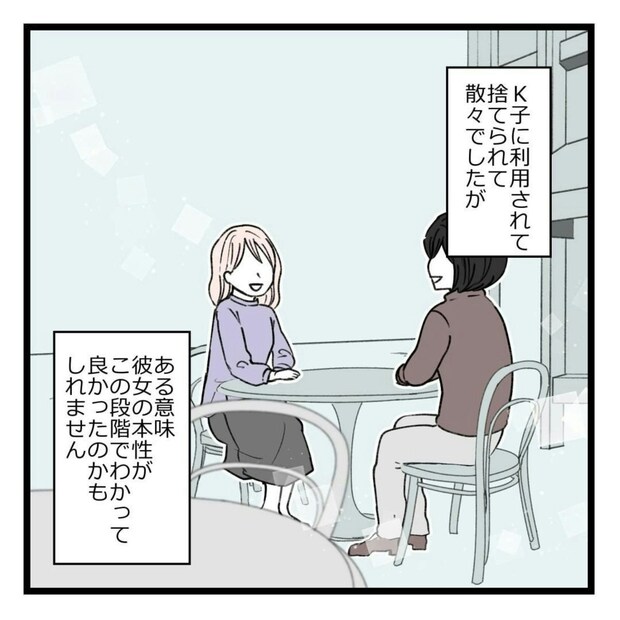 今までは社内の人と波風を立てたくないと思い、ついK子の言いなりになっていたりえ。ですが、散々K子に利用され、挙げ句の果てには切り捨てられたことで、我慢の限界に。今回、K子の無理なお願いをきっぱりと断ることができました。その後、パワハラで告発されたK子は出世コースから外されたようです。