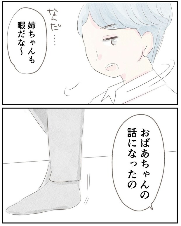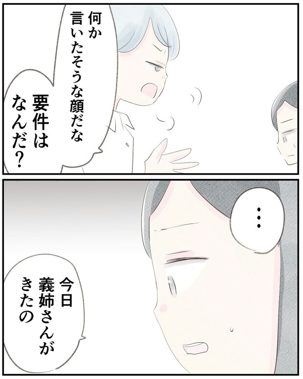 ゆうさんの深刻そうな顔が気になった夫でしたが、「義姉が来た」と言うと安心したような返事が返ってきました。しかし「おばあちゃんの話」で足が止まります。