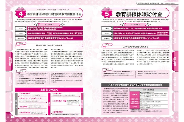 第3章「失業・転職」の目玉は、「教育訓練休暇給付金」の給付率引き上げ、「失業・転職期の給付の即応性向上」など。教育訓練を受けたら授業料以外にも給付金が出る「教育訓練休暇給付金」、雇用保険に入っていない人のための「求職者支援制度」などの詳細を掲載しました。「未払賃金立替払制度」「介護休業給付金」も取り上げています。