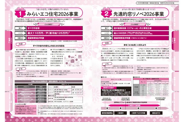 「みらいエコ住宅2026事業」「先進的窓リノベ2026事業」「給湯省エネ2026事業」などおトクな制度は、昨年に引き続き施行されています。2025年との制度の違いや、申請スケジュールなどはしっかりチェック。住宅ローン控除の改正、その他自治体の耐震工事助成なども解説しています。