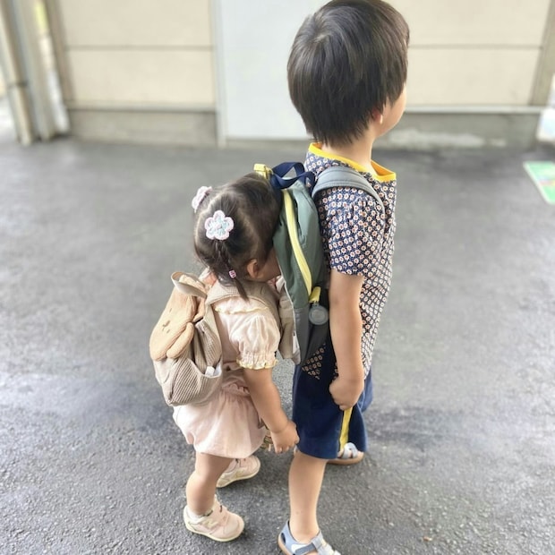 衝突事故かと思いきや、何とお兄ちゃんが好きすぎるあまりお兄ちゃんのリュックに頭を埋めている様子だそう。よろけないようにしっかりと足を広げて踏ん張っている様子のお兄ちゃんから優しさを感じずにいられないですよね。抱きつく、手をつなぐならわかりますが、お兄ちゃんに埋まりに行こうとするのはなかなか独特な愛情表現でびっくりですよね。