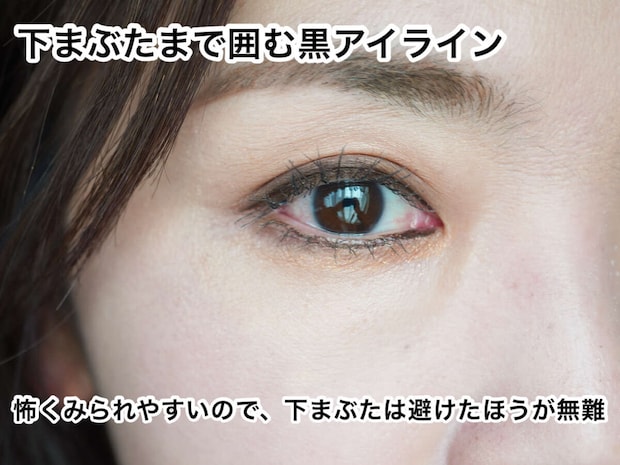 目元はできるだけヌーディに仕上げる風潮が強い現代では、黒アイラインをしっかり引くと目力が強くなりすぎてしまいます。さらに、下まぶたまで黒アイラインで囲むと怖い印象になりません。