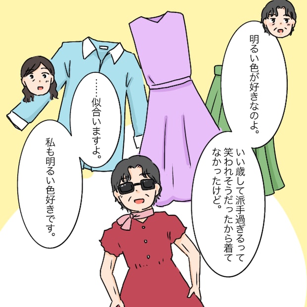 「明るい色が好きなのよ。いい歳して派手過ぎるって笑われそうだったから着てなかったけど」と知られざる秘密を公開。「・・似合いますよ。私も明るい色好きです」と義母もそっと秘密にしていたことを打ち明けました。