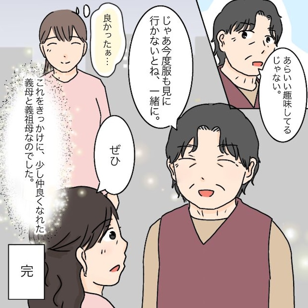 そんな義母に義祖母は「あらいい趣味してるじゃない、じゃあ今度服も見に行かないとね一緒に」とニコリ。義祖母の言葉に義母も笑顔で「ぜひ」と答えました。2人のやりとりを見て「良かったぁ・・」と呟いた桃子さん。これをきっかけに、少し仲良くなれた義母と義祖母だったのでした。