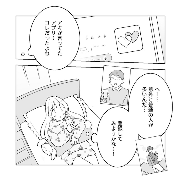 アキに教えてもらったマッチングアプリをダウンロードして登録者男性の写真を見てみると、カフェで微笑む優しそうな男性や、山登りが趣味と言うさわやかそうな男性など予想していたよりも普通の人が多くて驚くとともにホッとしました。これなら登録してみてもいいかなと思えたのです。