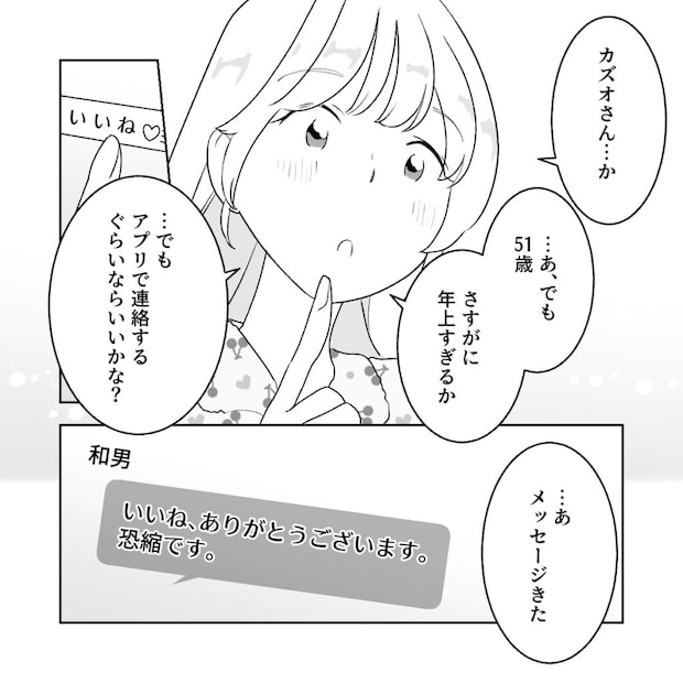 男性の名前は和男さん。でも51歳というと28歳も上・・・倍以上の年齢はさすがに年上すぎるかなと思いましたが、アプリで連絡するくらいならいいかな、と考え直して、とりあえず「いいね」をすると、すぐに和男さんから「いいね、ありがとうございます。恐縮です。」とメッセージが送られてきました。