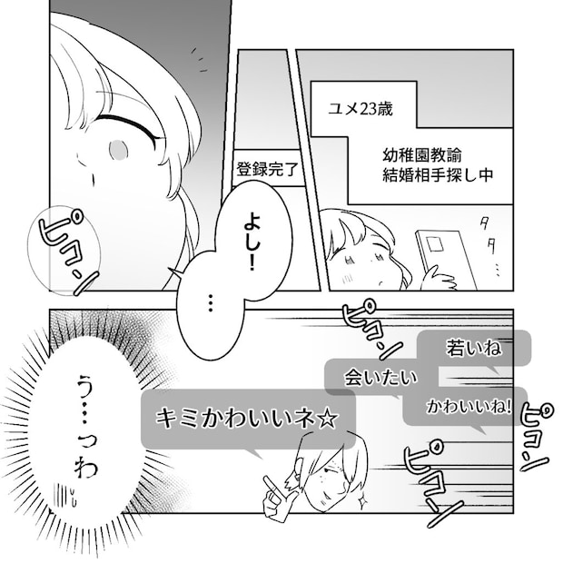 運命の王子様に会うため!私はマッチングアプリに登録しました。『ユメ23歳、幼稚園教諭、結婚相手探し中』・・・入力するとすぐにピコンピコンと「若いね」「かわいいね!」「会いたい」「キミかわいいネ」など軽そうな感じのメッセージが次々に届いたのでちょっと引いてしまいました。