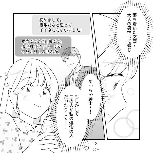 他に届いていたメッセージが軽かっただけに、和男さんの落ち着いた文面に大人の男性を感じてホッとしました。「初めまして。素敵だなと思ってイイネしちゃいました!」とメッセージを返すと、「本当ですか?光栄です。よければメッセージのやり取りしませんか。」と返信がありました。すぐ会おうと言わずにまずはメッセージのやりとりと言われて、紳士だなぁと好感を持ちました。もしかしてこの人が私の運命の人だったりして!初めてのマッチングアプリに不安もあったけれど、和男さんのように紳士的な男性と知り合えたから勇気を出して始めてみてよかったと思いました。