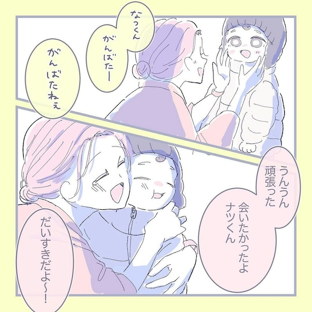 ナツくんとの久々の再会に、おもいがあふれて止まらない heraco.さん。ナツくんも、ママに会えない寂しさの中で、おさないながらにがんばっていたことを伝えています。