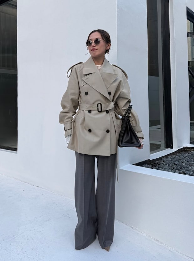 「ハリ感のある立体的なグレイッシュベージュのショートトレンチに、シルエットの美しいグレーパンツを合わせたハンサムなスタイリング。クラシックになり過ぎないようウエストをギュッと絞り、袖口からトップスのレースをのぞかせるなど、さり気ない女性らしさをプラスしました」