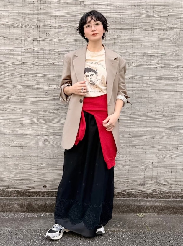「腰に巻いたスエットの赤を効かせて、大人のバランスに引き寄せたテーラードジャケット×レース×古着のミックススタイル。そこにメタリックなメガネをかけることで、コーデを引き締めてくれます」