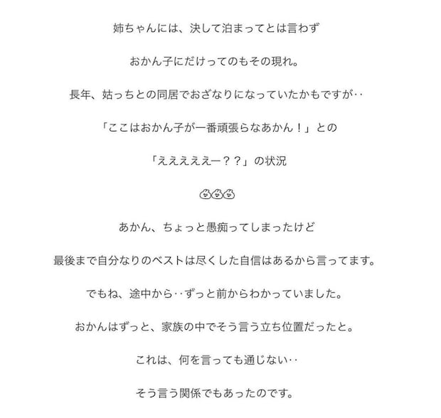 母親は、おかんさんの姉には弱っている自分の姿を見せたくないようです。そのため、おかんさんにばかり頼ることが多くなっています。一方で、おかんさんも母親の期待に応えようと一生懸命尽くしますが、どうしても母親はなかなか満足してくれませんでした。
