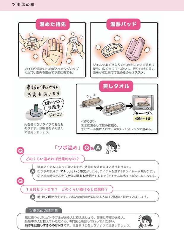 筆者の崎田さんが実際に鍼灸院で施術を受け、東洋医学のツボ療法の効果を実感したといいます。そこから、自分でできるツボ押しについて取材を行い、セルフケアをまとめたのが「ツボ編」です。