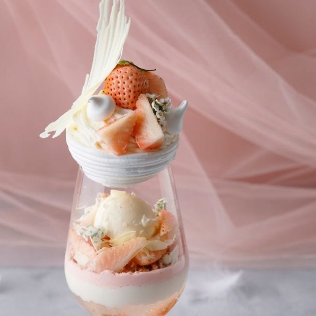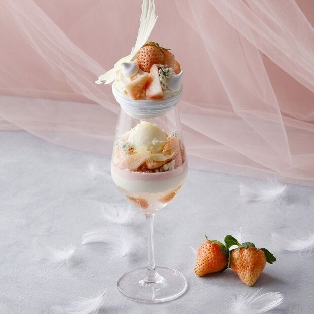 グラスの中にはほんのり塩味を感じるクリームチーズのアイスクリームが、白いちごをはじめとする全体の甘さを引き締め、奥深い味わいを演出。周囲には、みずみずしい白いちごやエディブルフラワー、ホワイトチョコレートコポー、パールクラッカンを華やかにあしらっている。